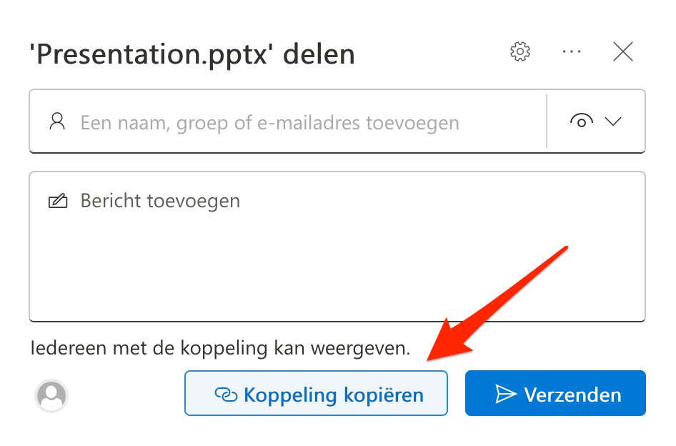 - Zorg ervoor dat je de tekst "Iedereen met de koppeling kan weergeven" ziet; zo niet klik op de tekst boven de Koppeling kopiëren knop en selecteer bij Meer instellingen de optie Kan weergeven.